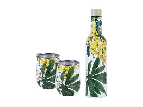 Get set for summer with this 3-piece insulated wine set from the Golden Summer collection. Created in collaboration with Sydney artist ‘the Blck Pen’, it features a contemporary floral design. This stylish set includes a 750ml leakproof insulated bottle and two 350ml insulated tumblers. Made from quality double-wall stainless steel, itβs the perfect way to keep your drinks cool for picnics and adventures. Designed in collaboration with Sydney artist Neha Gupte, known as the Blck Pen Features an original contemporary floral design inspired by the flowers of the Australian summer 750ml insulated bottle is leakproof – keeps contents cold for up to 24 hours or hot for up to 8 hours 2 x 350ml tumblers keep contents hot or cold for up to 4 hours Made from double-wall insulated stainless steel for superior durability